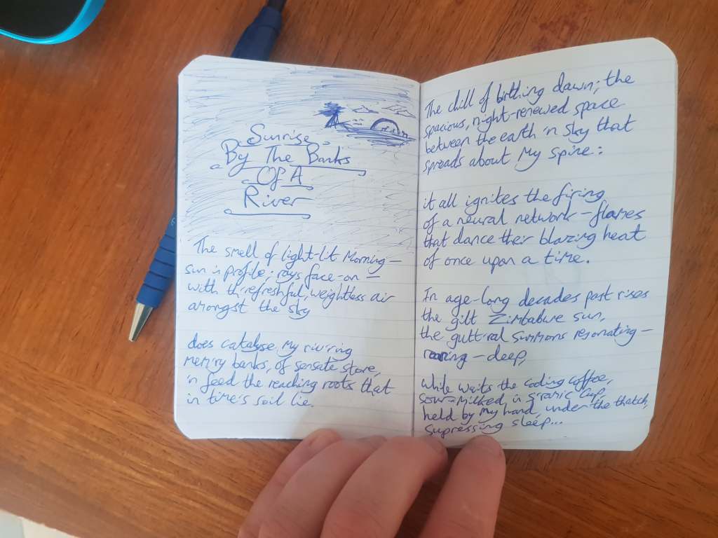 So, here is the idea: I am going to fill notebooks with hand-written poetry, making various selections from all those found on here, along with doodles and haiga. For example: one book might contain only tanka poems; another only free-verse poems; one might be full of poems that could be interpreted to all be touching on a certain theme; etc. They can also be partially or wholly bespoke – so, someone can make a list of my poems that they want, and those will be the ones I write in. Plus others, if there is space for it.