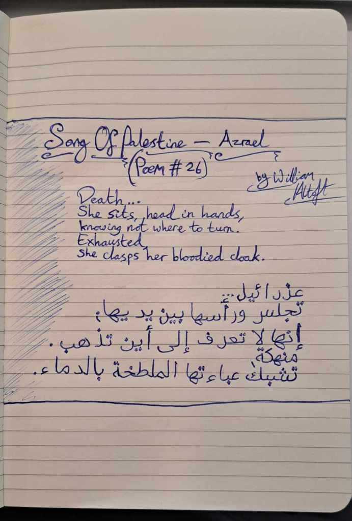 Song Of Palestine – Azrael by William AltoftPosted on December 21, 2023 Death…She sits, head in hands,knowing not where to turn.Exhausted,she clasps her bloodied cloak. Image credit – Baldwin Share this: Click to share on X (Opens in new window) X Click to share on Facebook (Opens in new window) Facebook Like Loading... Related